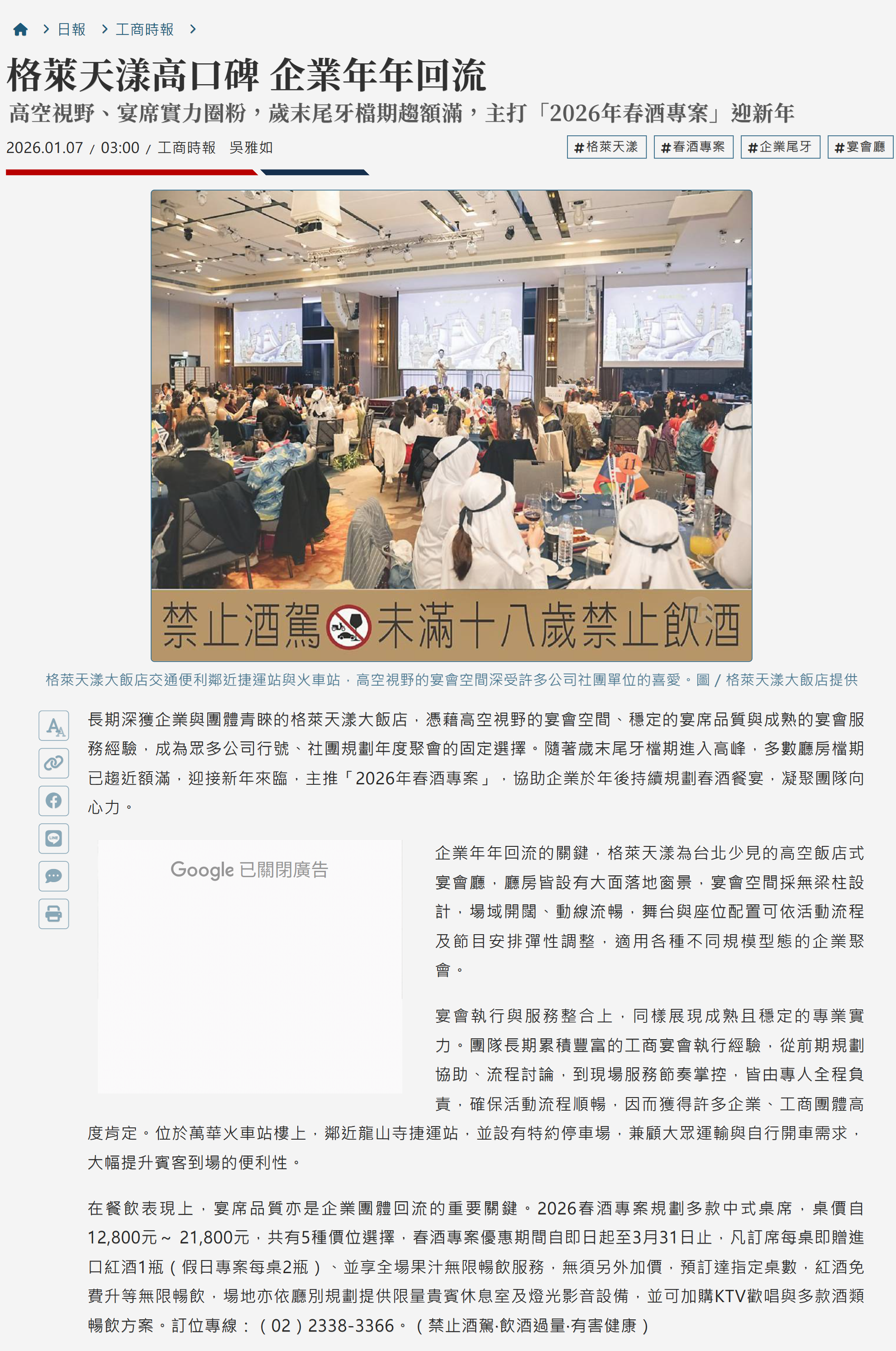 迎接新年度,我們推出「2026年春酒專案」,並獲《工商時報》專文報導,肯定格萊天漾在企業宴會市場中的專業實力與口碑表現。