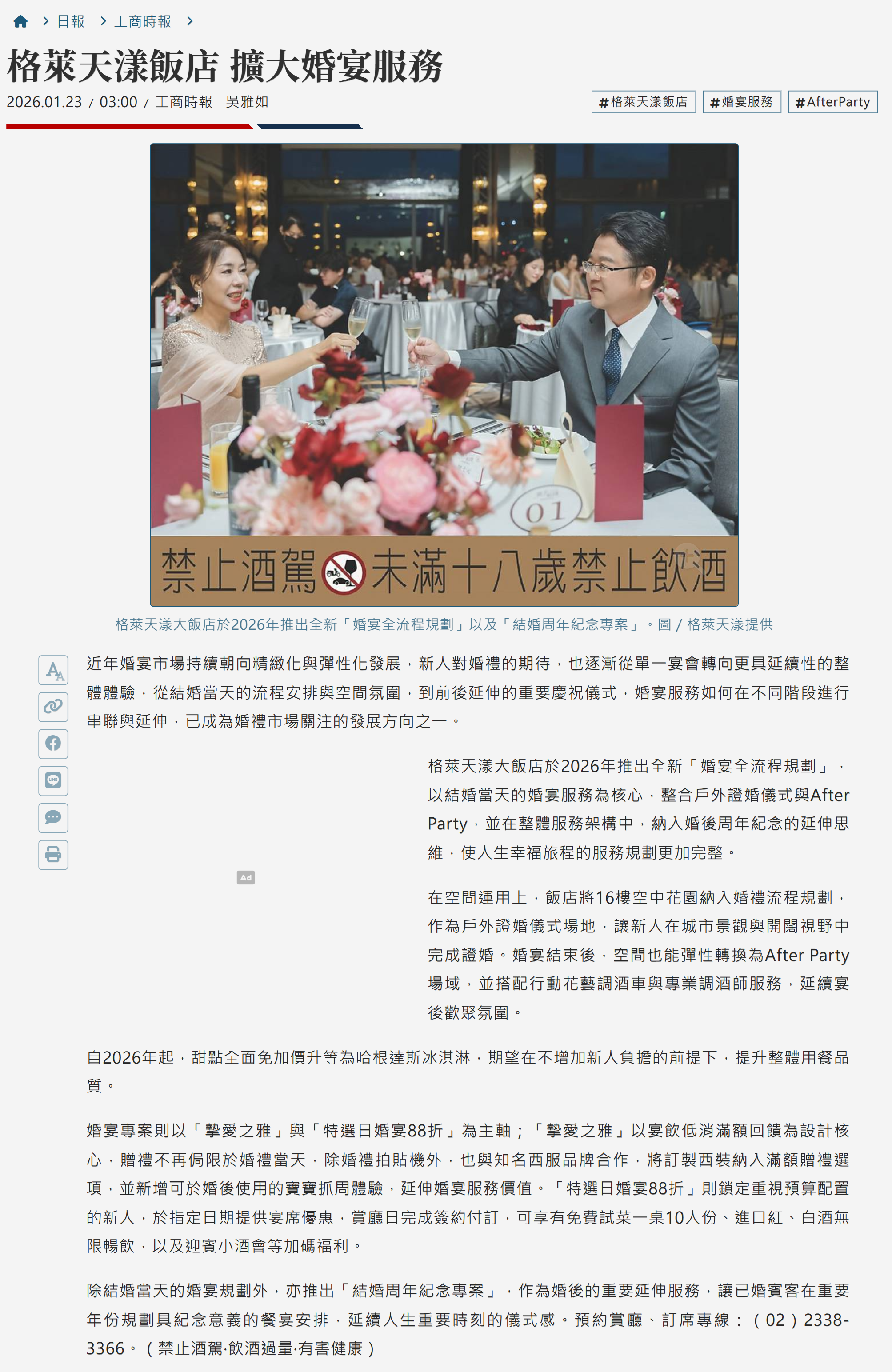 回應新人對婚禮體驗日益精緻且具延續性的期待,格萊天漾大飯店於2026年正式推出「婚宴全流程規劃」與「結婚週年紀念專案」,結合指定日優惠、滿額回饋等多元方案,並加碼祭出甜點全面升等 Häagen-Dazs 哈根達斯冰淇淋免加價禮遇,持續優化宴會服務體驗與餐點品質,相關服務亦獲《工商時報》與《中時新聞網》專文報導肯定,展現品牌於婚宴市場的專業實力與口碑信賴!