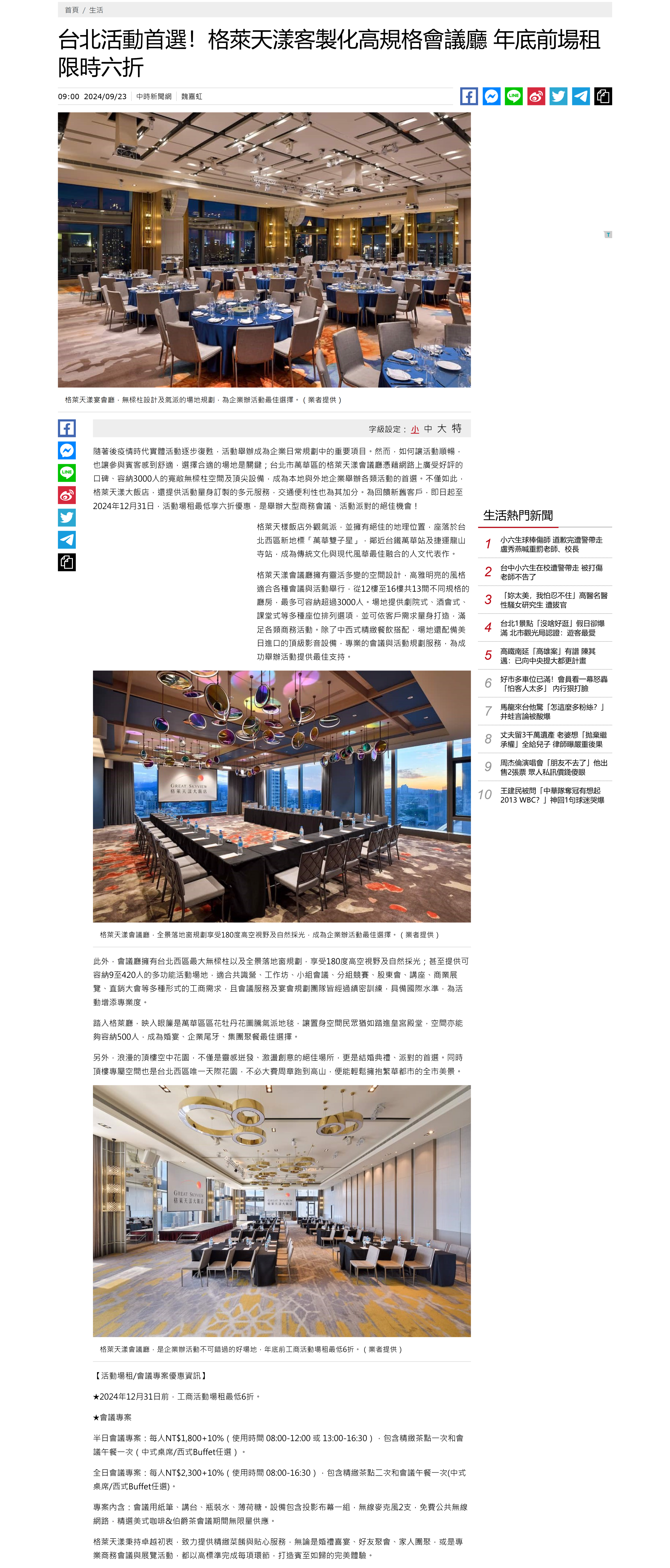 格萊天漾大飯店以絕佳的交通便利性、氣派的外觀設計、頂級進口影音設備,及彈性多元的空間規劃,成為台北地區企業舉辦各類活動的首選場地,並以卓越的服務品質深受客戶信賴與好評。