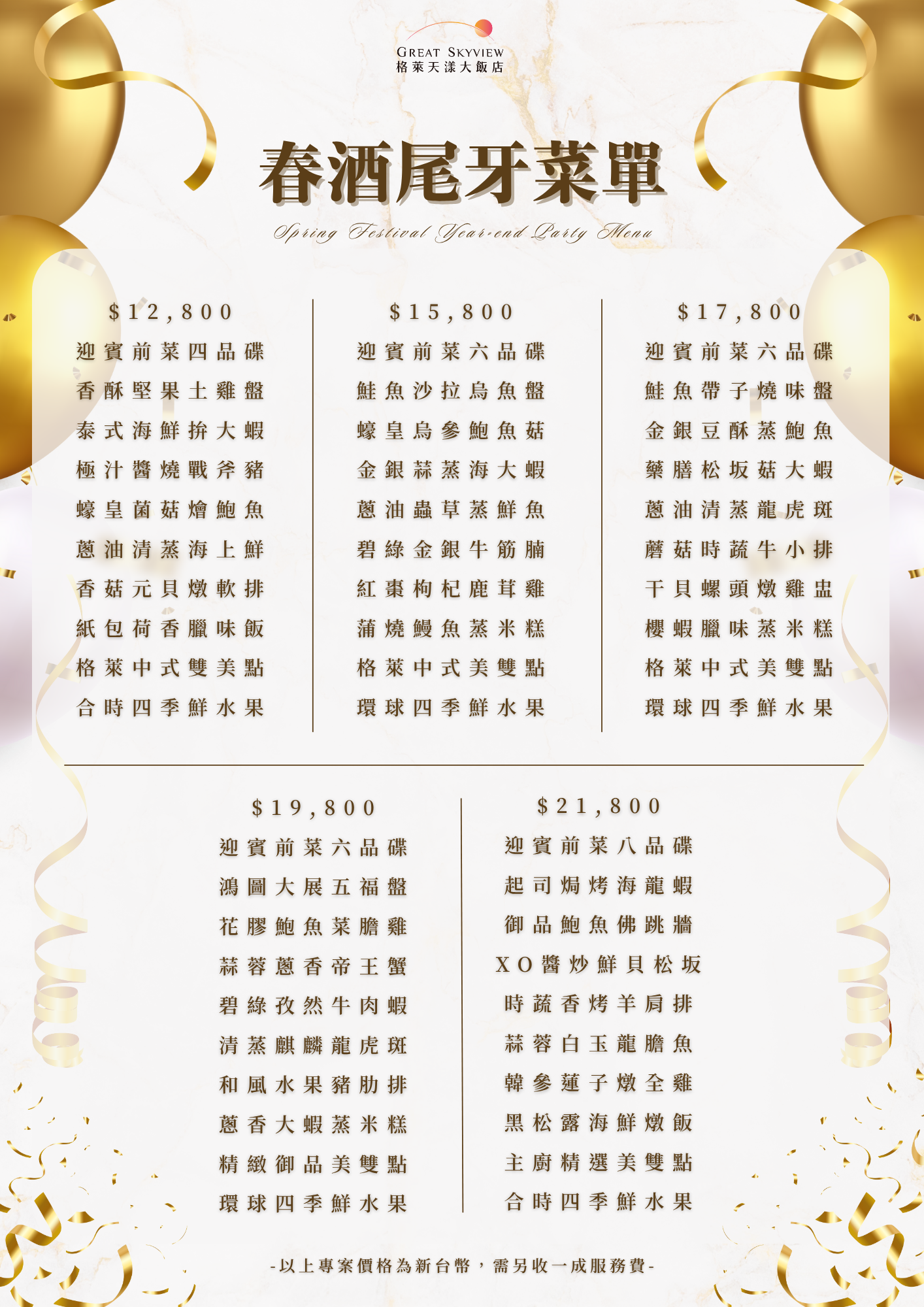 中式桌席每桌NT$15,800 / NT$17,800 / NT$19,800 / NT$21,800(四種方案)