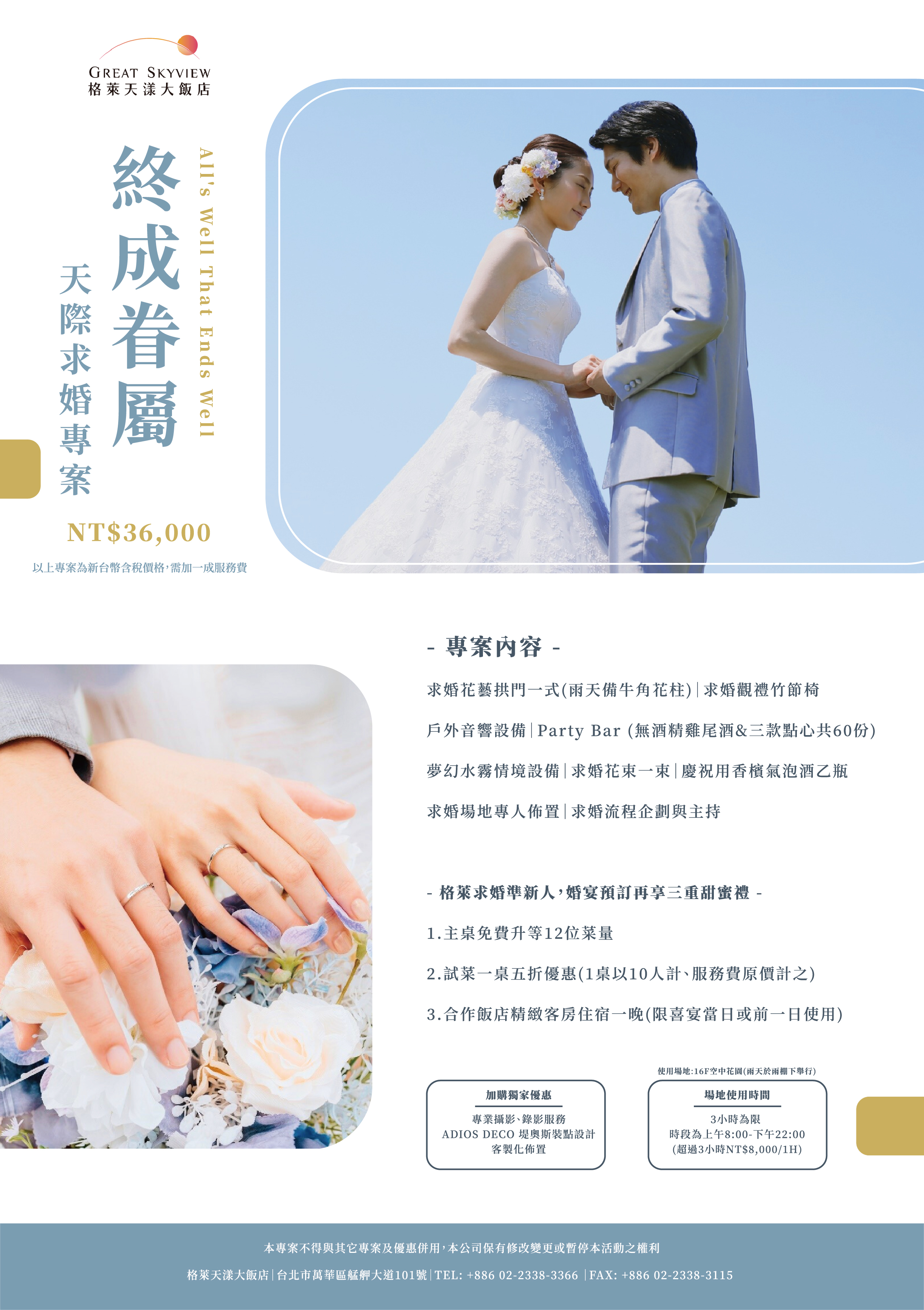即日起,凡預訂天際求婚專案者,後續加訂「格萊天漾婚宴專案」,享婚宴三重好禮回饋!