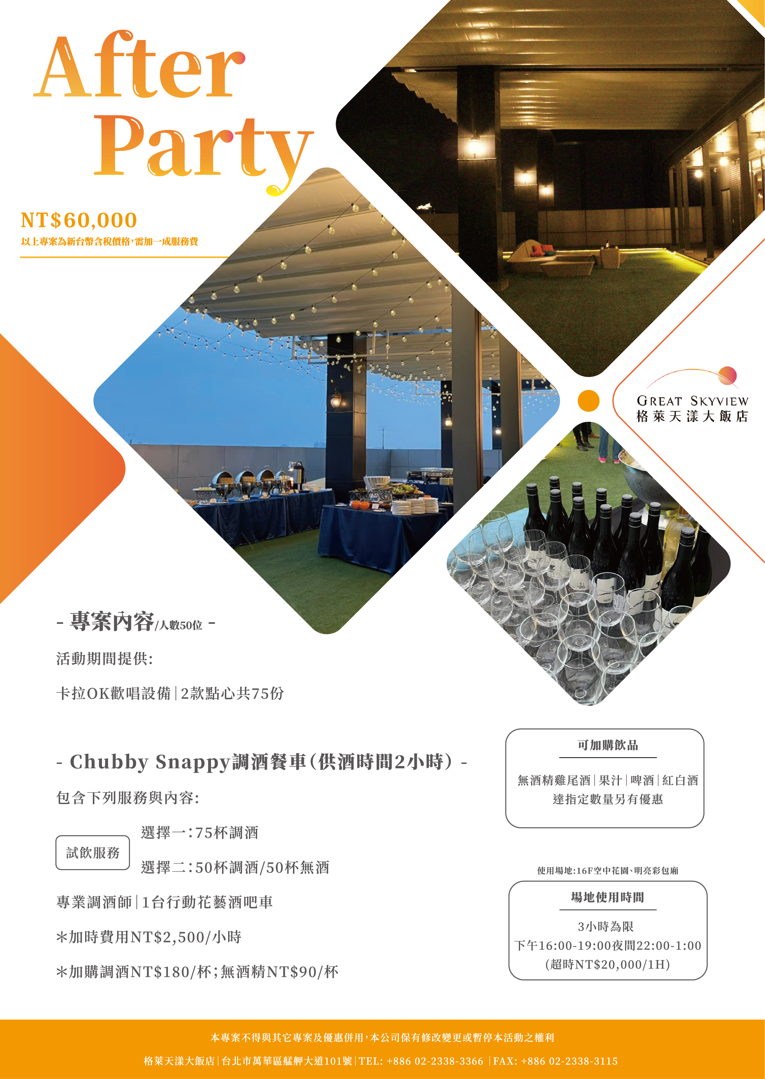在台北格萊天漾大飯店16樓空中花園,享受專屬3小時After Party包場,搭配行動花藝酒吧車、K歌歡唱、派對小點與城市星空,讓你們自在續攤、盡情狂歡。